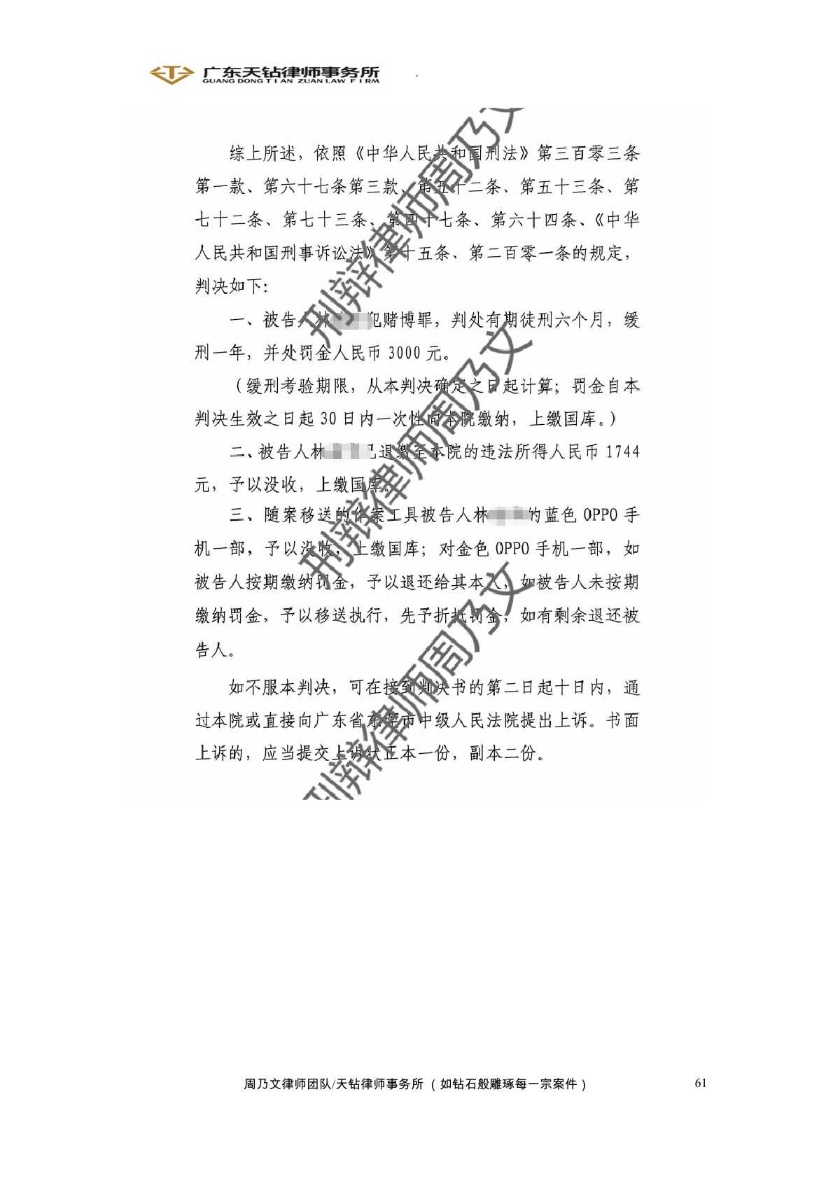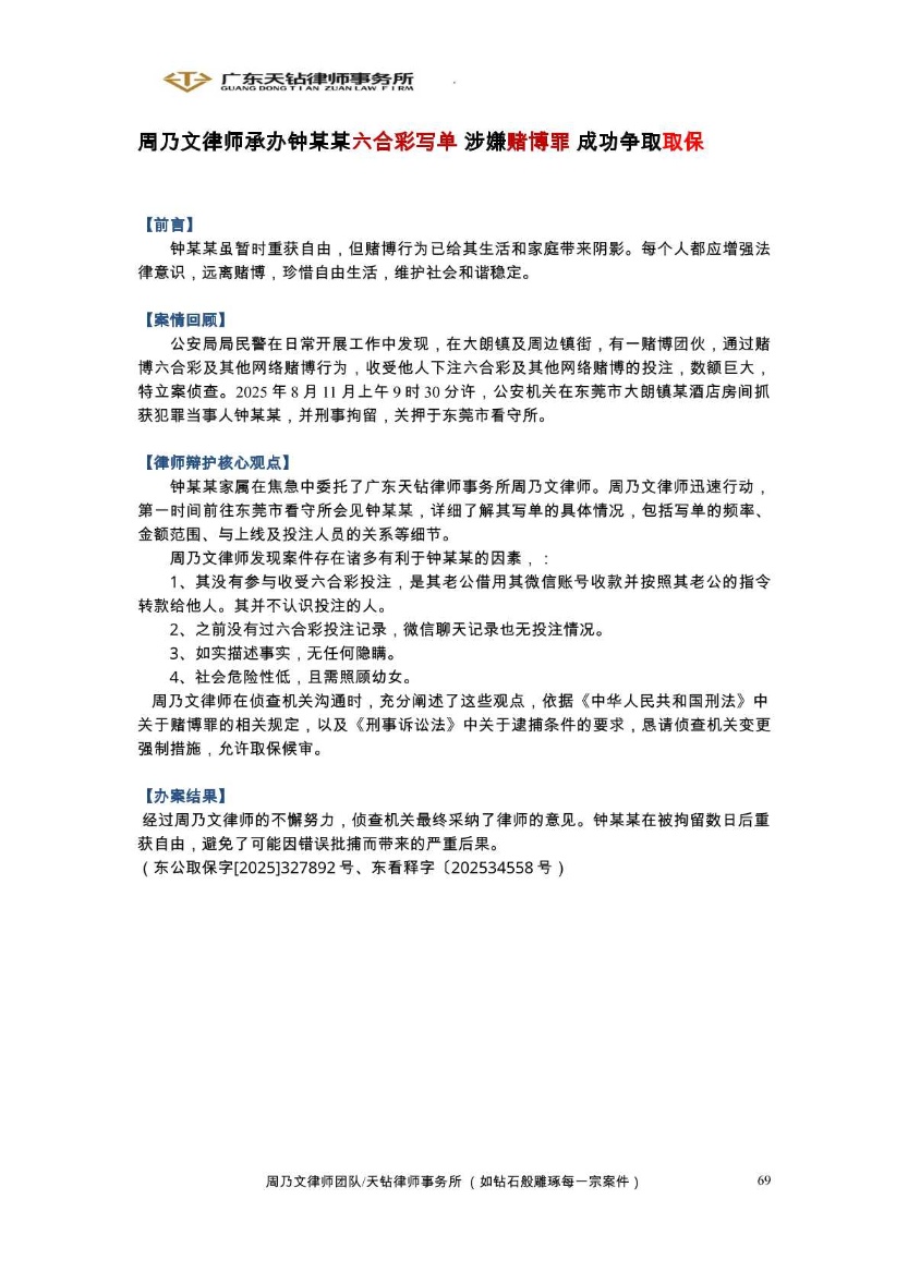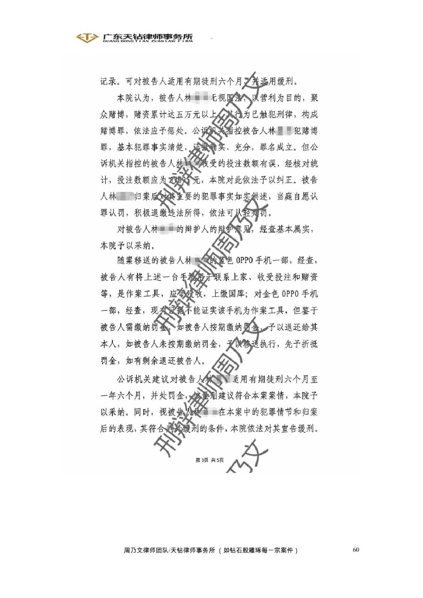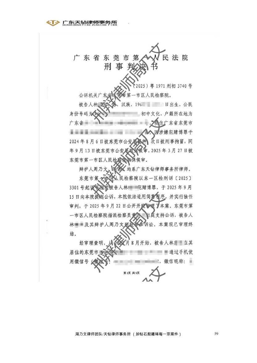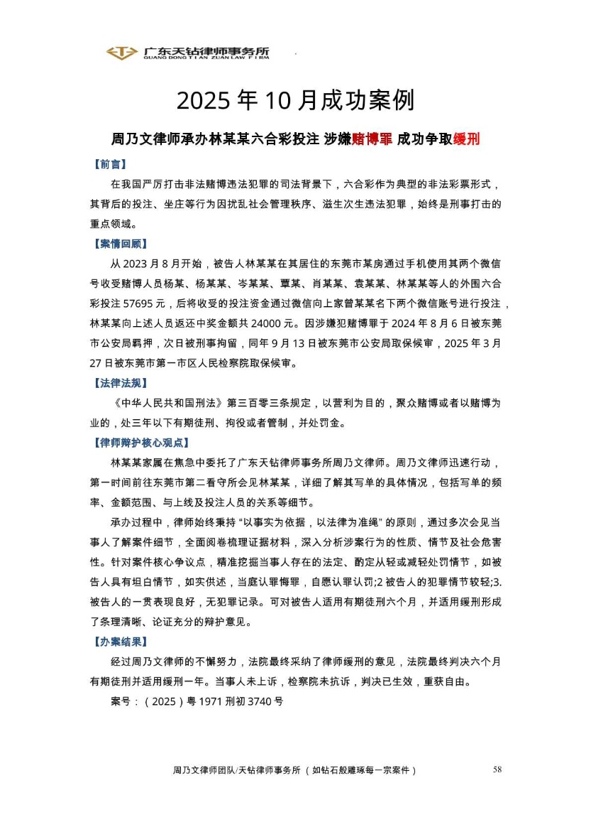 > 2025年10月成功案例 周乃文律师承办林某某六合彩投注 涉嫌赌博罪 成功争取缓刑